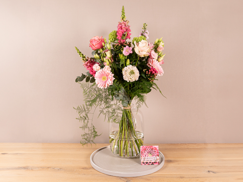 Stijlvol boeket in roze- en pasteltinten. Losjes geschikt met speels groen, en hoogteverschil.